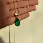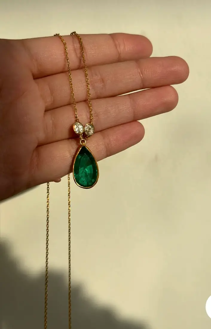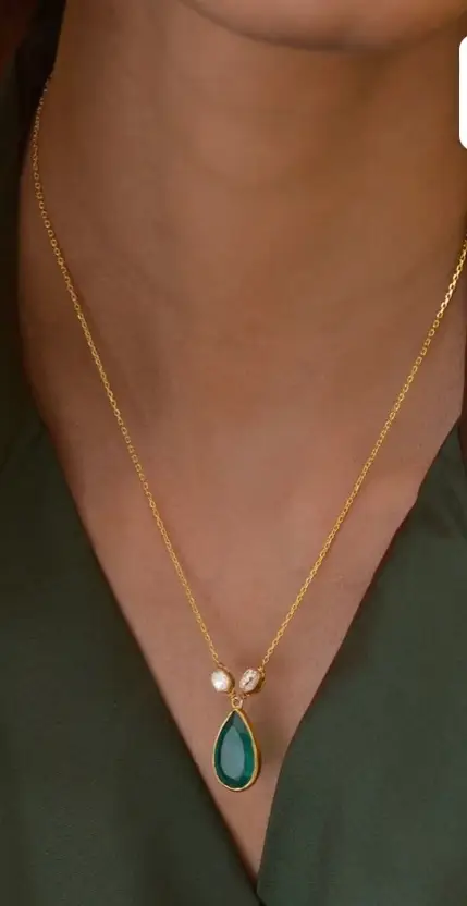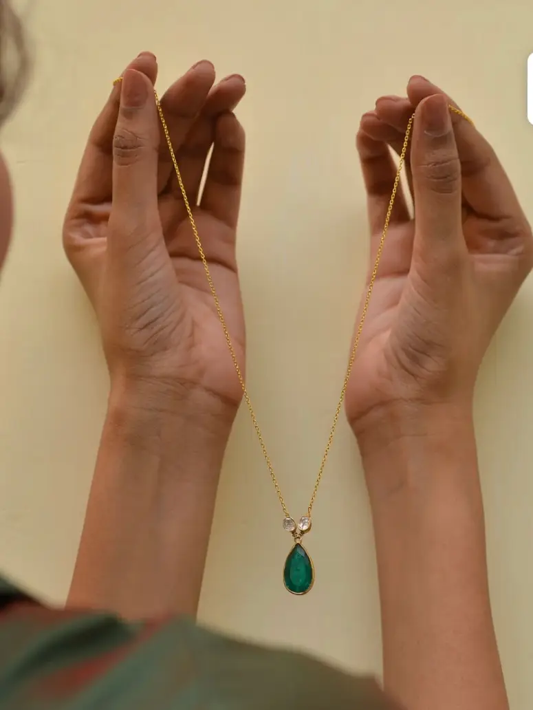 Celebrate simplicity and elegance with our Aarohi Emerald Drop Necklace, handcrafted in pure 92.5 silver and luxuriously plated with 18k gold. This minimalist necklace features a graceful teardrop-shaped green stone, crowned with two subtle kundan accents that reflect understated charm.