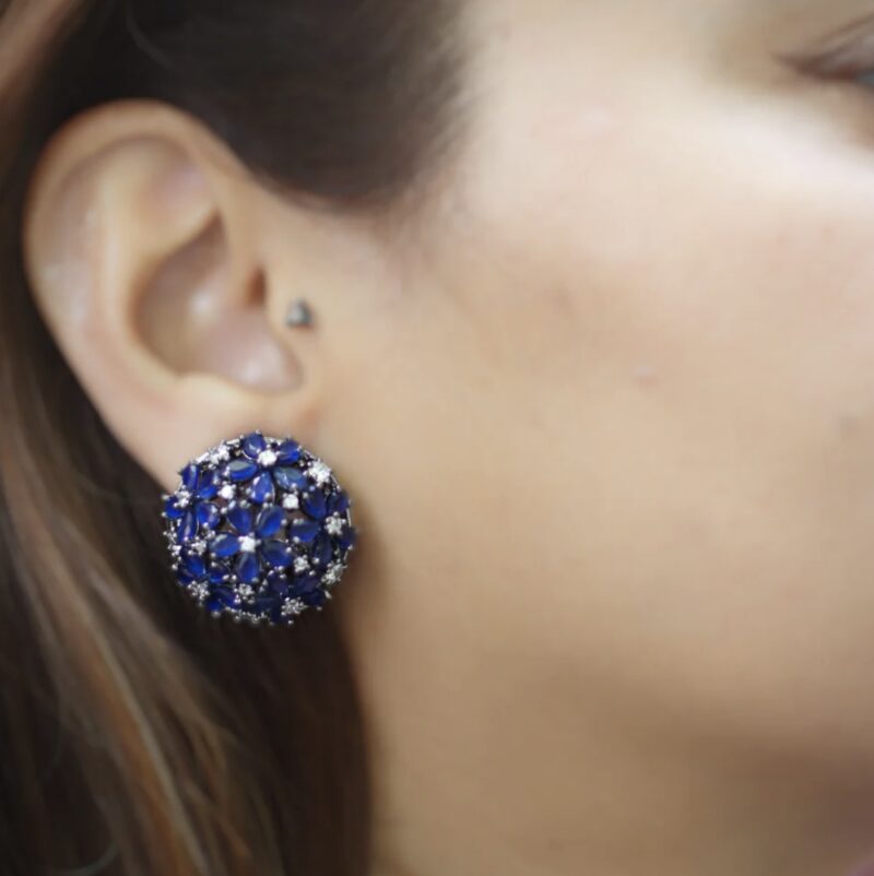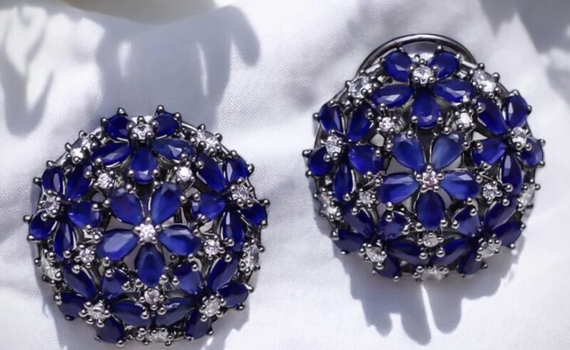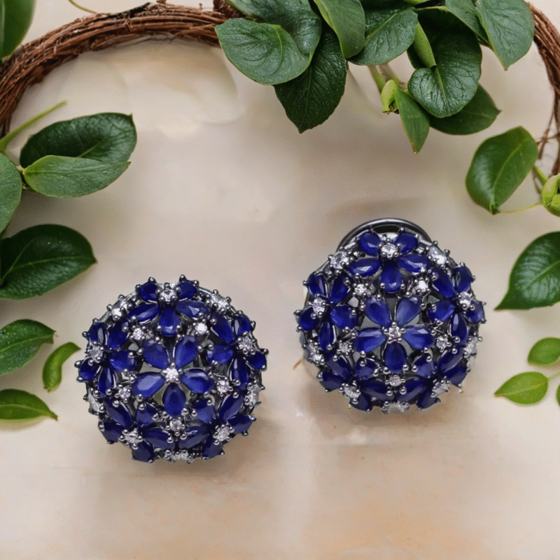 Handcrafted in 92.5 pure silver, each stud reflects meticulous artistry, where every gemstone is carefully set by hand to ensure perfect balance and shine. The sparkling white stones catch the light beautifully, while the vibrant blue gems add a rich pop of color — reminiscent of royal treasures and serene skies.