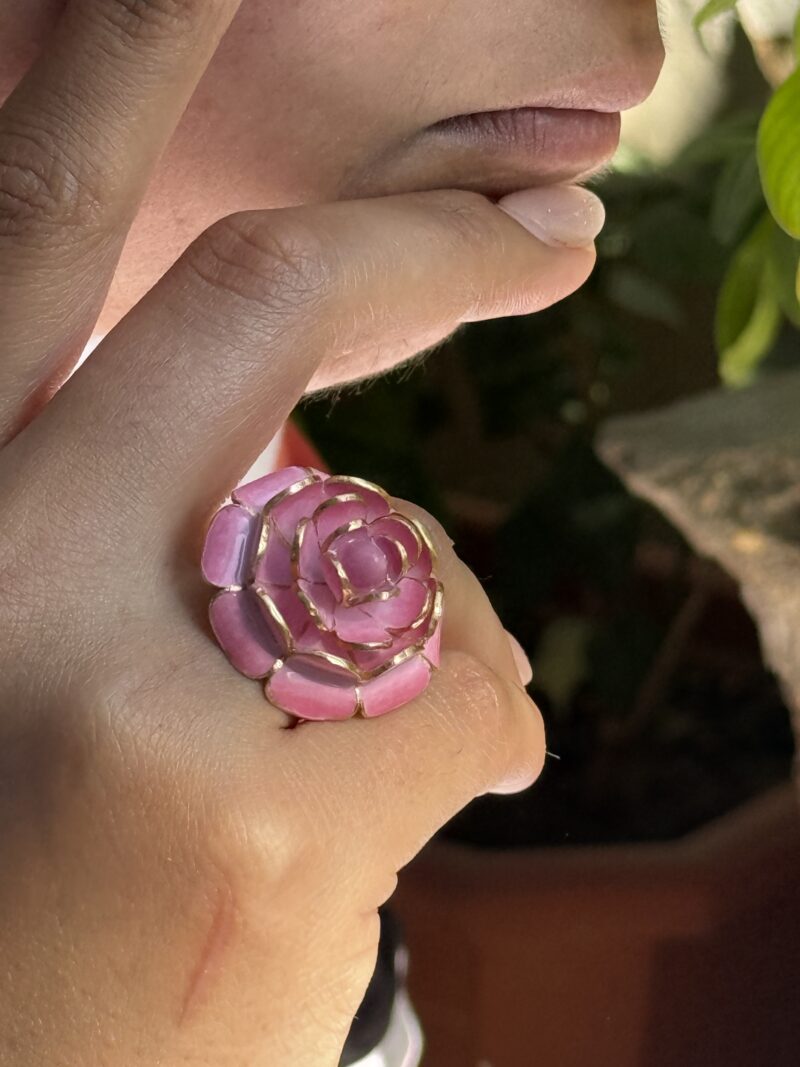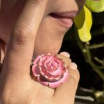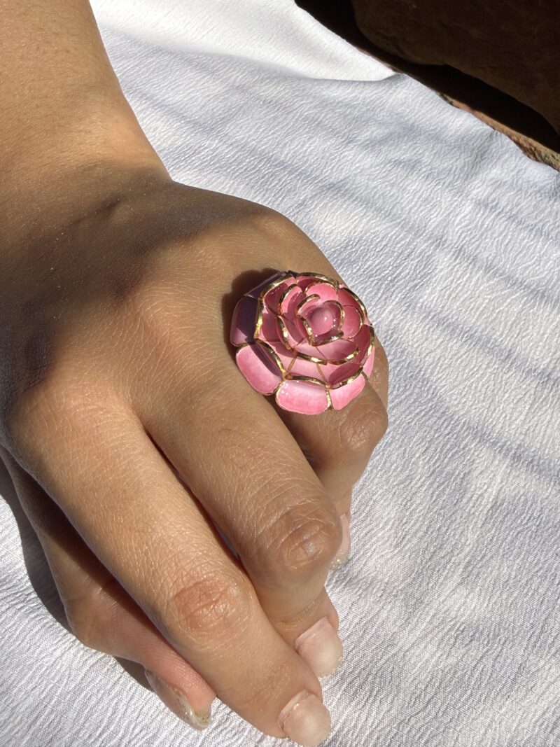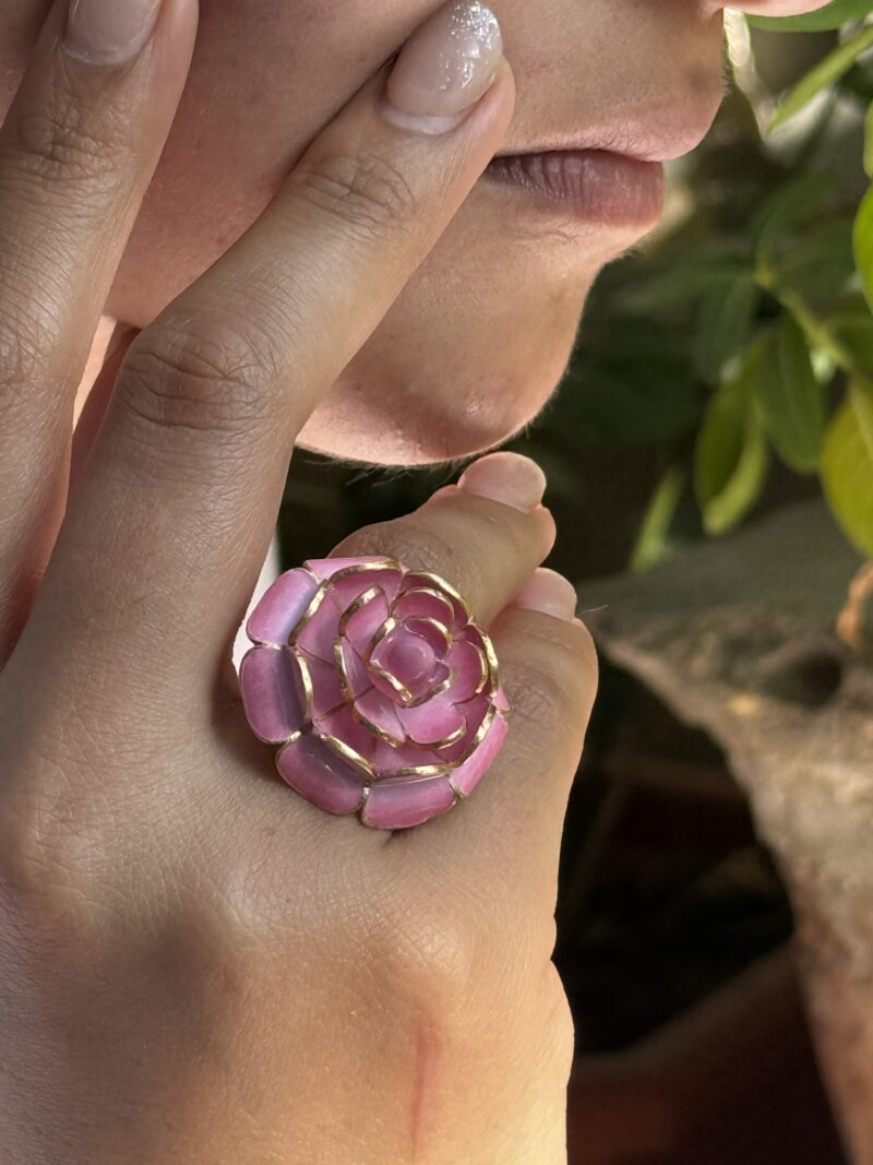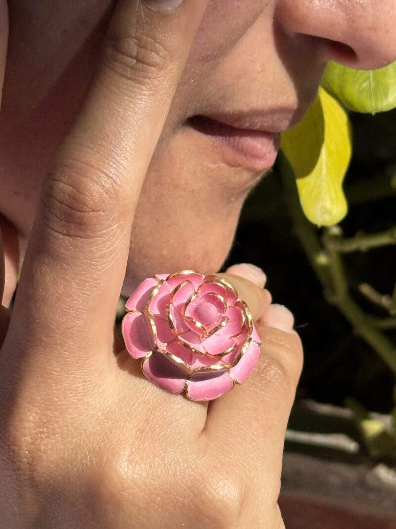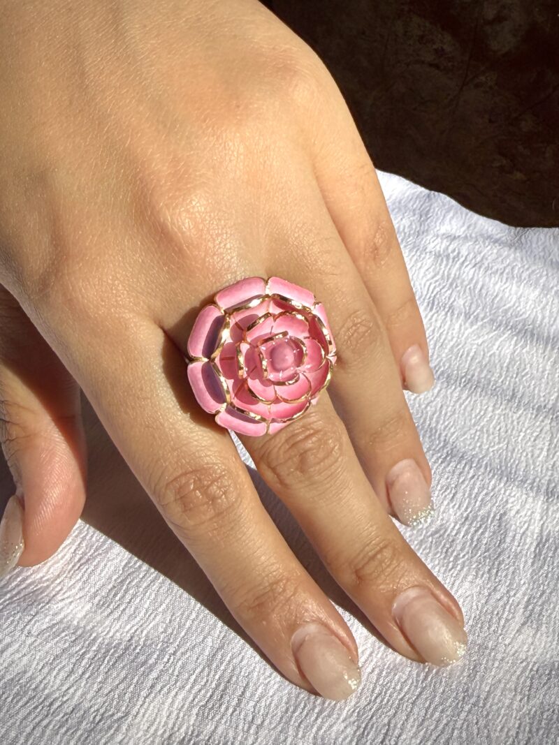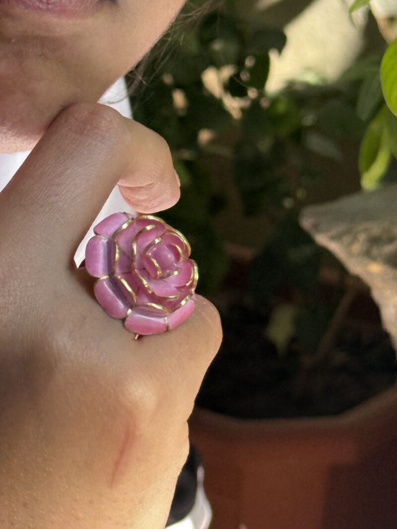Celebrate timeless craftsmanship with this exquisite pink rose statement ring, beautifully crafted on a silver base and enhanced with intricate meenakari (enamel) work. Designed in the form of a blooming rose, the ring features soft pink enamel petals outlined with delicate metallic detailing, creating depth, shine, and a lifelike floral appearance.