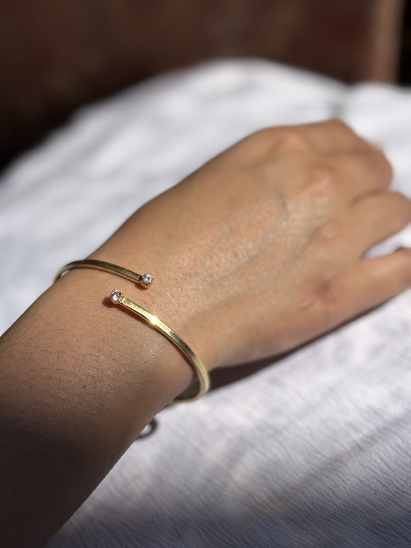 Add a touch of effortless elegance to your everyday style with this minimalist silver open cuff bracelet. Crafted on a silver base, this sleek bracelet features a clean, modern silhouette with delicate crystal accents at each open end, offering subtle sparkle without overpowering the design.