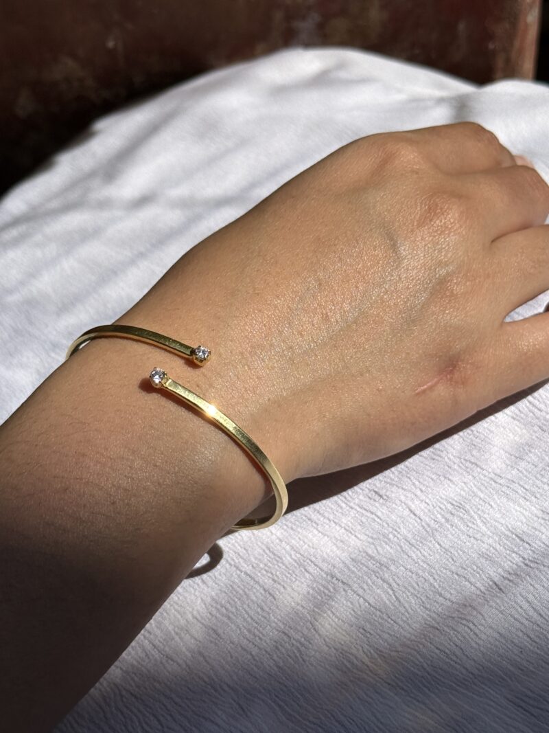 The open cuff style allows for a comfortable, adjustable fit, making it perfect for daily wear or layering with other bracelets. Its timeless design transitions seamlessly from casual outfits to elegant evening looks.