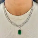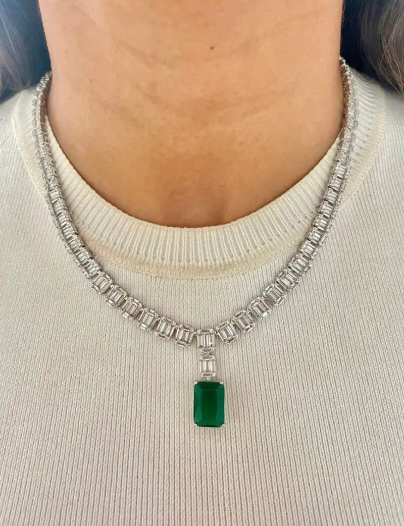 Make a bold yet refined statement with this pure silver handcrafted necklace, designed in a classic emerald-cut CZ setting with a striking ruby-red drop pendant. Each stone is meticulously placed to create a seamless, luxurious line of sparkle, finished with a rich red rectangular gemstone that draws the eye and adds a pop of color.