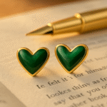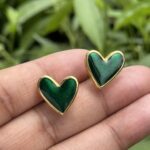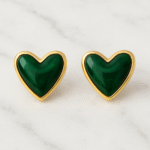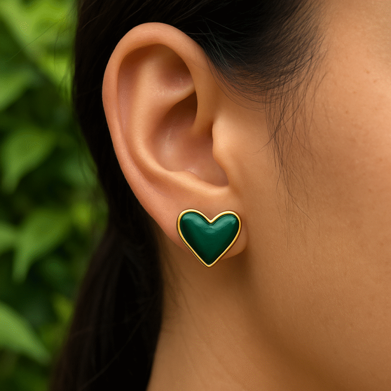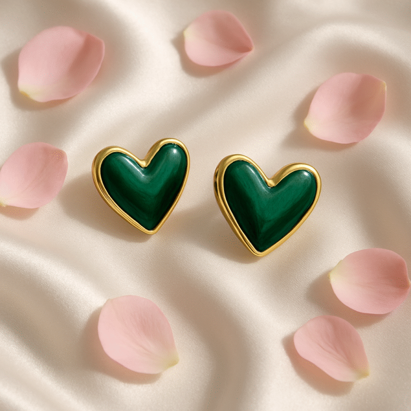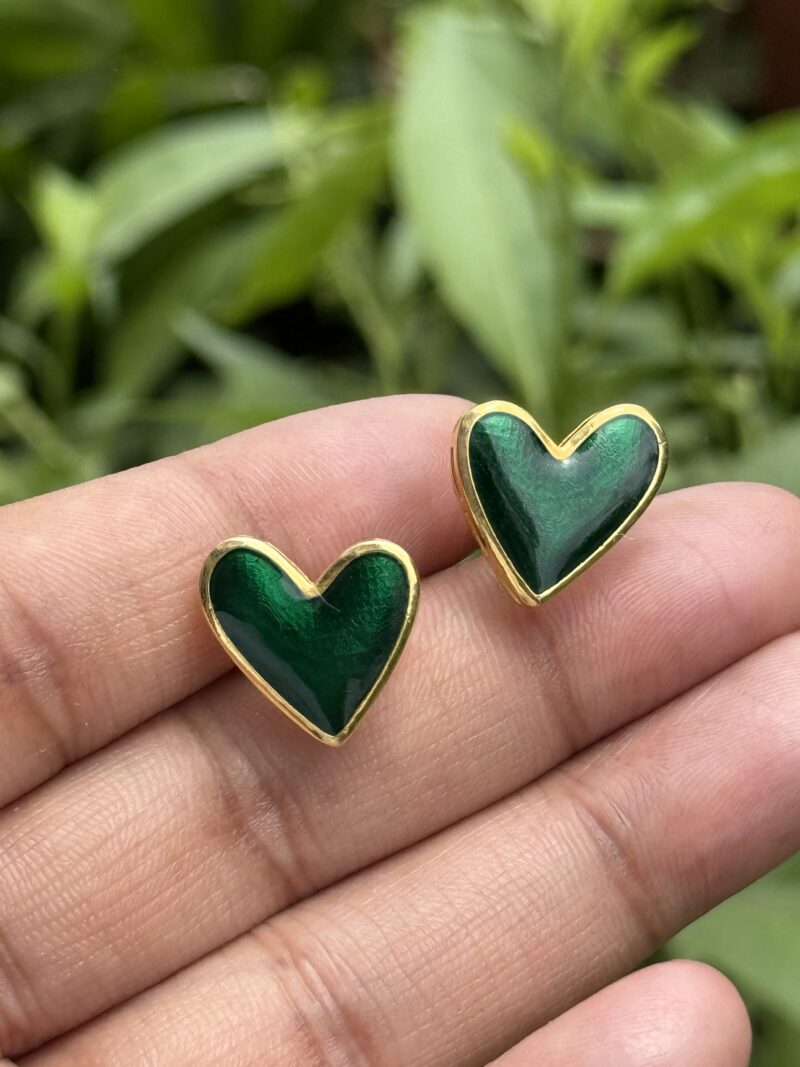 Bring a touch of playful elegance to your style with these Korean heart-inspired earrings, crafted from pure silver and finished with sumptuous gold plating. The charming heart shape is adorned with rich green enamel work, blending modern trends with age-old artisan craftsmanship for a unique, eye-catching look. Lightweight and easy to wear, these earrings are a perfect expression of love and personality—ideal for everyday outfits or thoughtful gifting.
