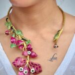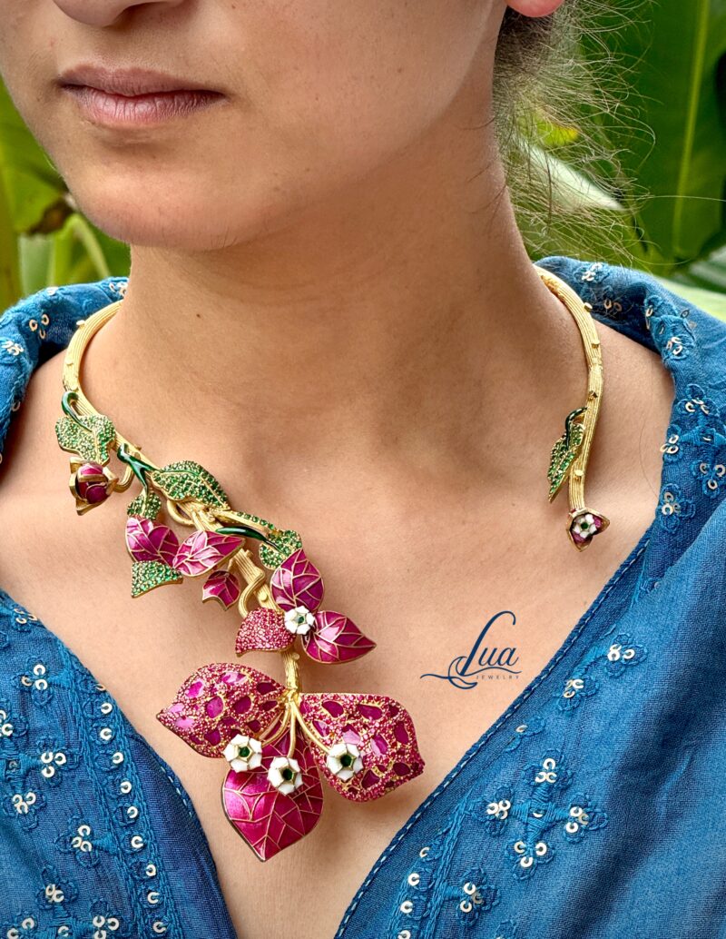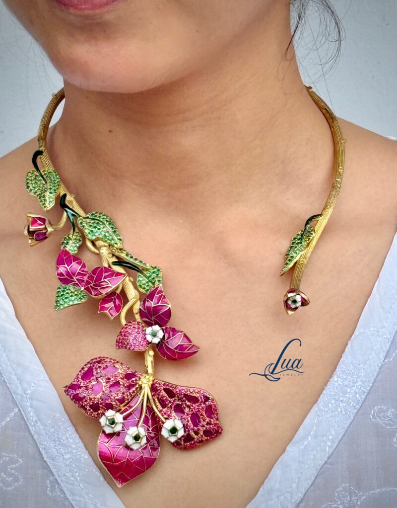 Turn heads with this exquisite handmade 92.5 silver necklace, a true piece of wearable art inspired by blooming florals. Crafted by skilled artisans, the necklace features a striking design of vibrant pink enamel flowers and green leaf detailing, accented with sparkling stones that bring each petal to life.