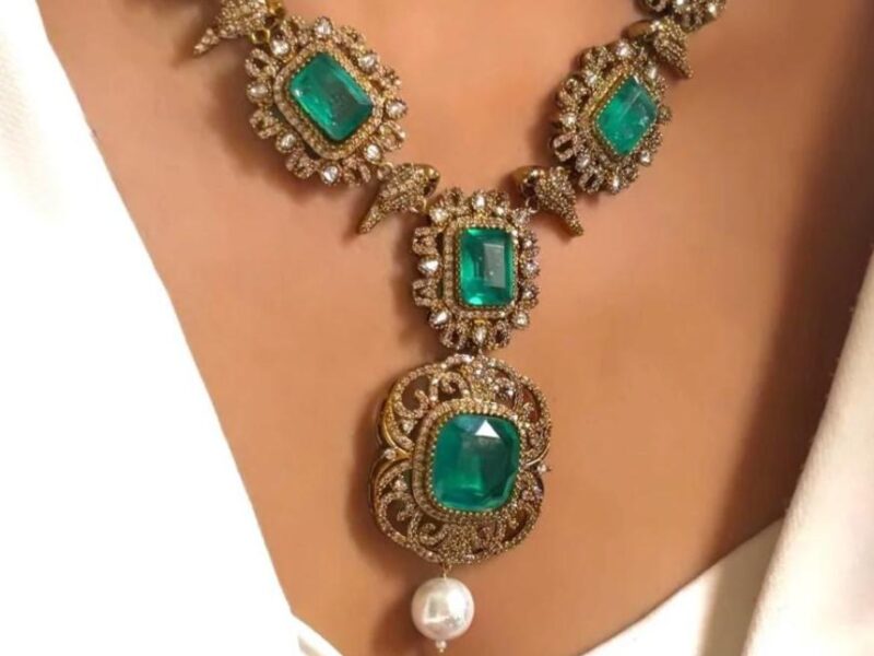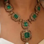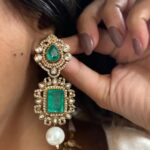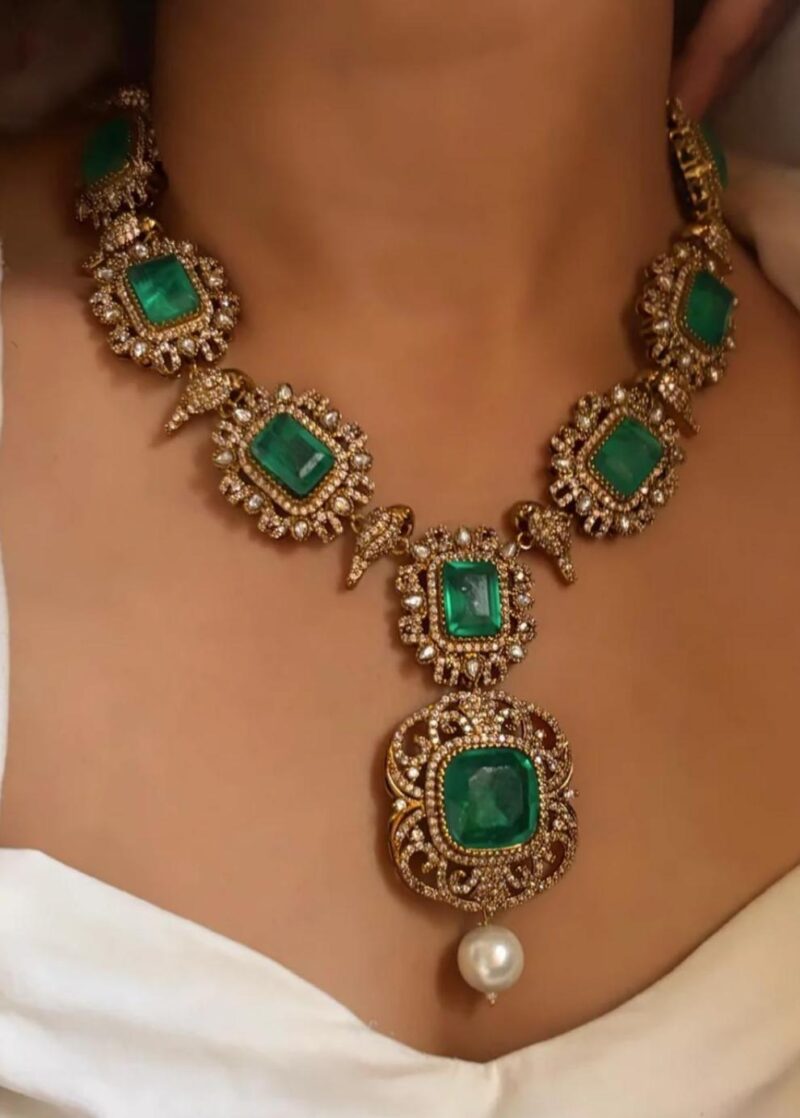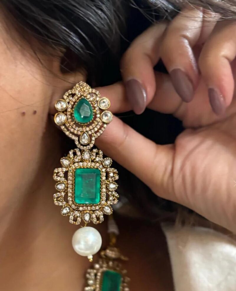 Made in pure silver, this regal set showcases mint-hued emerald doublets as the centerpiece of each motif, beautifully framed by shimmering Moissanite accents for a radiant, diamond-like sparkle. The necklace is finished with a single statement pearl drop, adding grace and softness to the overall look.