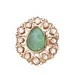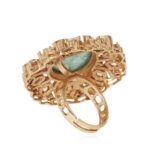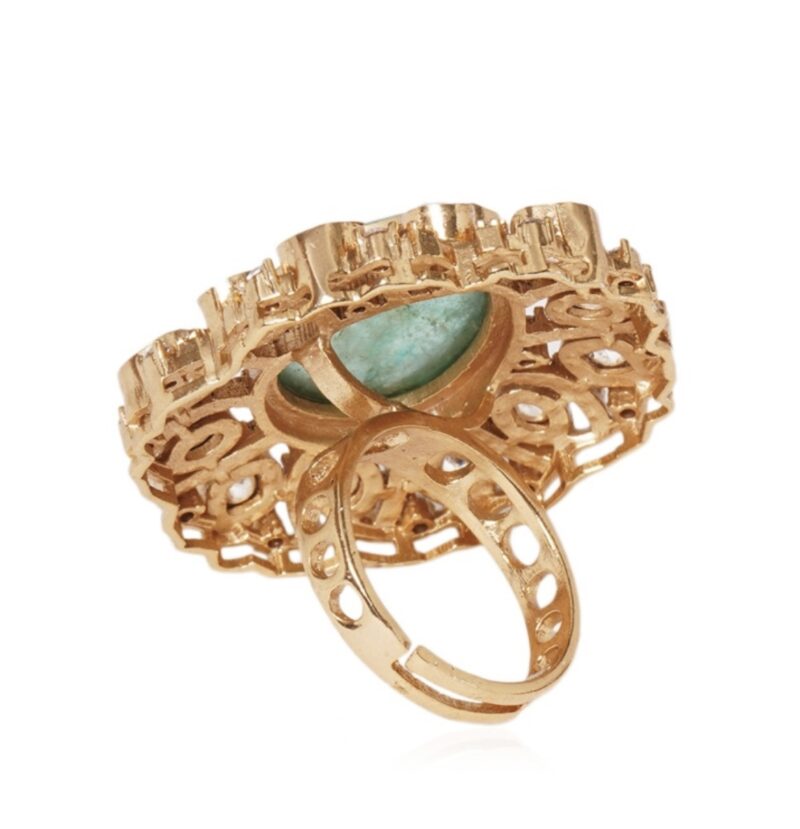 Elevate your look with this exquisite statement ring, featuring a stunning green teardrop stone at the center, beautifully surrounded by delicate pearls in a radiant floral design. Handcrafted with intricate detailing and finished in a rich gold tone, this ring captures timeless elegance and traditional charm.