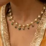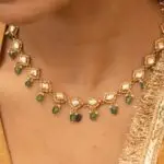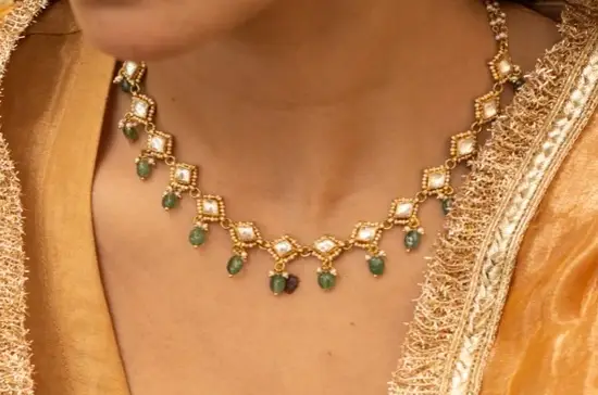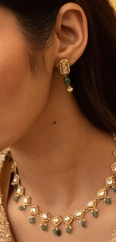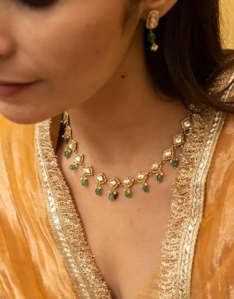 Grace your neckline with the timeless charm of our Noor Kundan Drop Necklace, exquisitely handcrafted in pure silver and plated with radiant 18k gold. This delicate choker features a beautifully arranged zig-zag pattern of traditional Kundan stones, each framed in a royal setting and adorned with rich green bead drops that sway with grace.