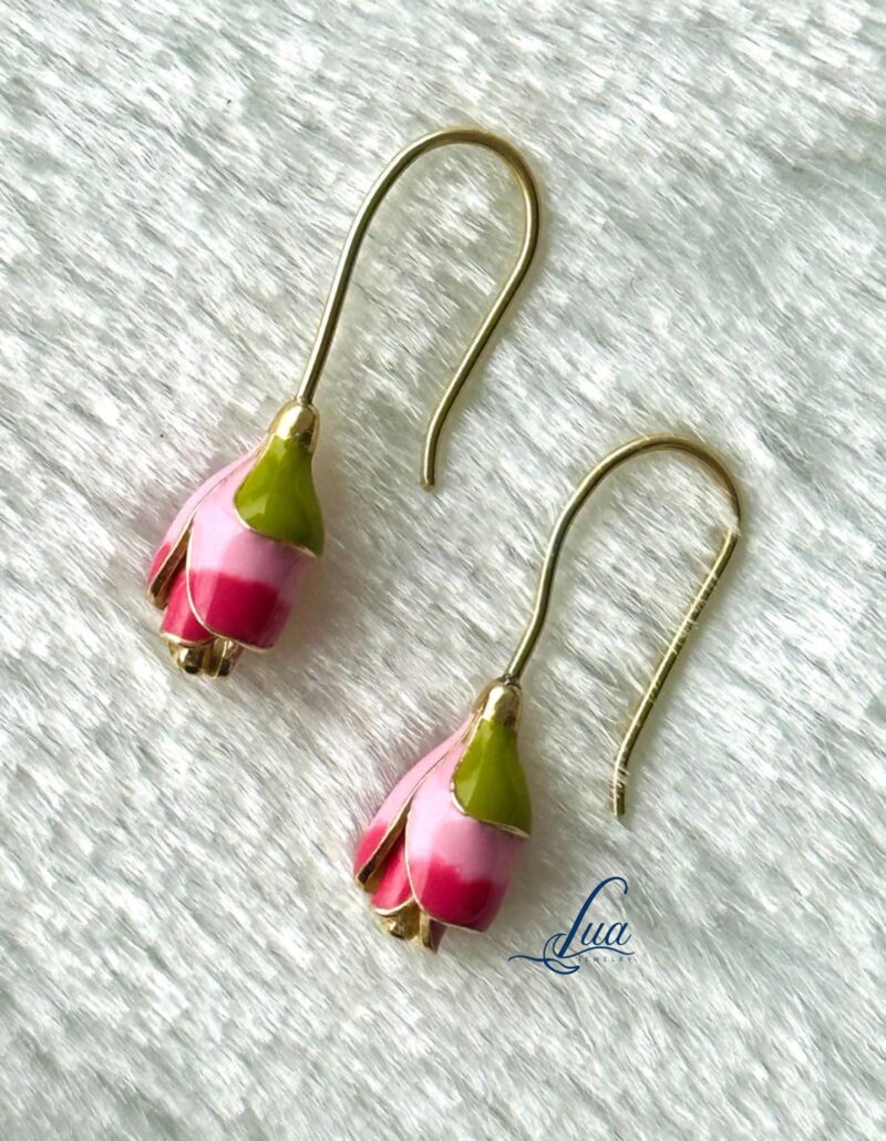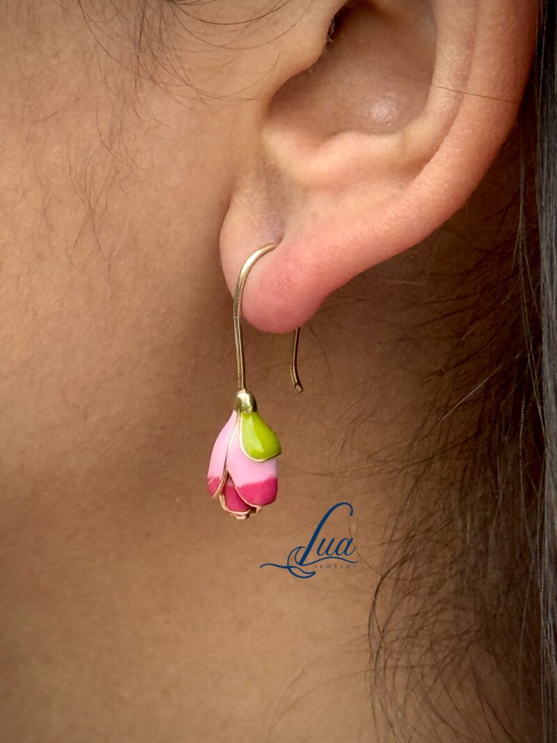 Bring the delicate charm of nature to your jewelry collection with our Rosette Bloom Earrings. These enchanting earrings feature a hand-enameled pink rosebud with a fresh green leaf accent, delicately suspended from pure silver hooks. Each pair is lovingly handcrafted by skilled artisans, making every piece unique and special.